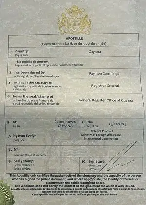 Documents issued in Guyana can be officially certified for international use with an apostille stamp or by consular legalization (depending on the intended country of use).